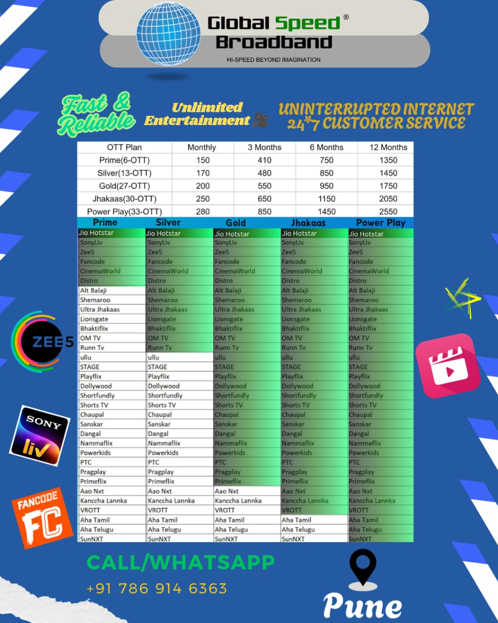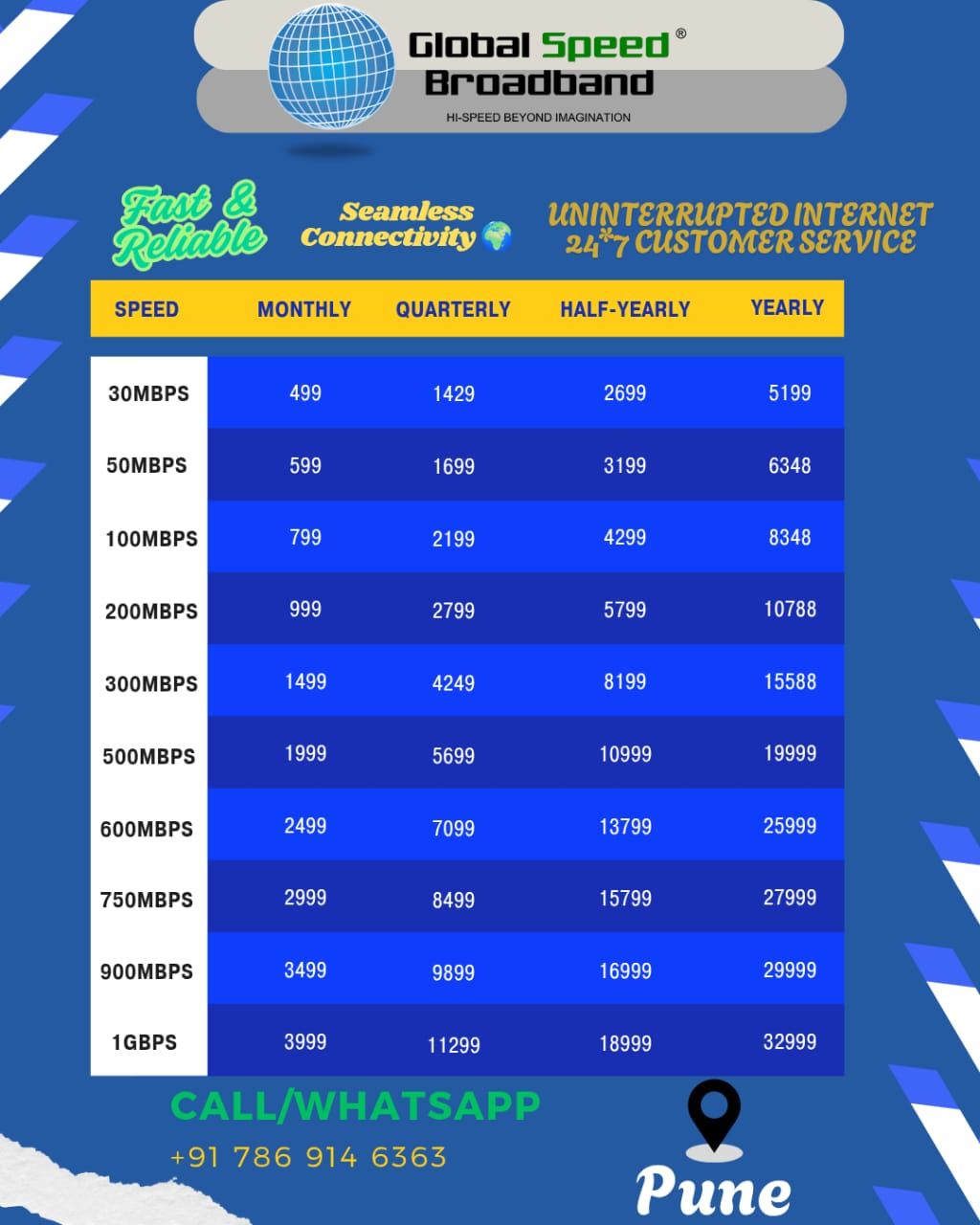 Global Speed Broadband is a innovative organization that has driven changes in this industry by taking the lead in providing affordable broadband access to home users and corporates, when it was thought to be impossible and still continues to do so. Today we provide with the one of the cheapest internet services in the city Global Speed Broadband is an ISP operating currently only in Pune. and has established itself as one of the significant players in the City.